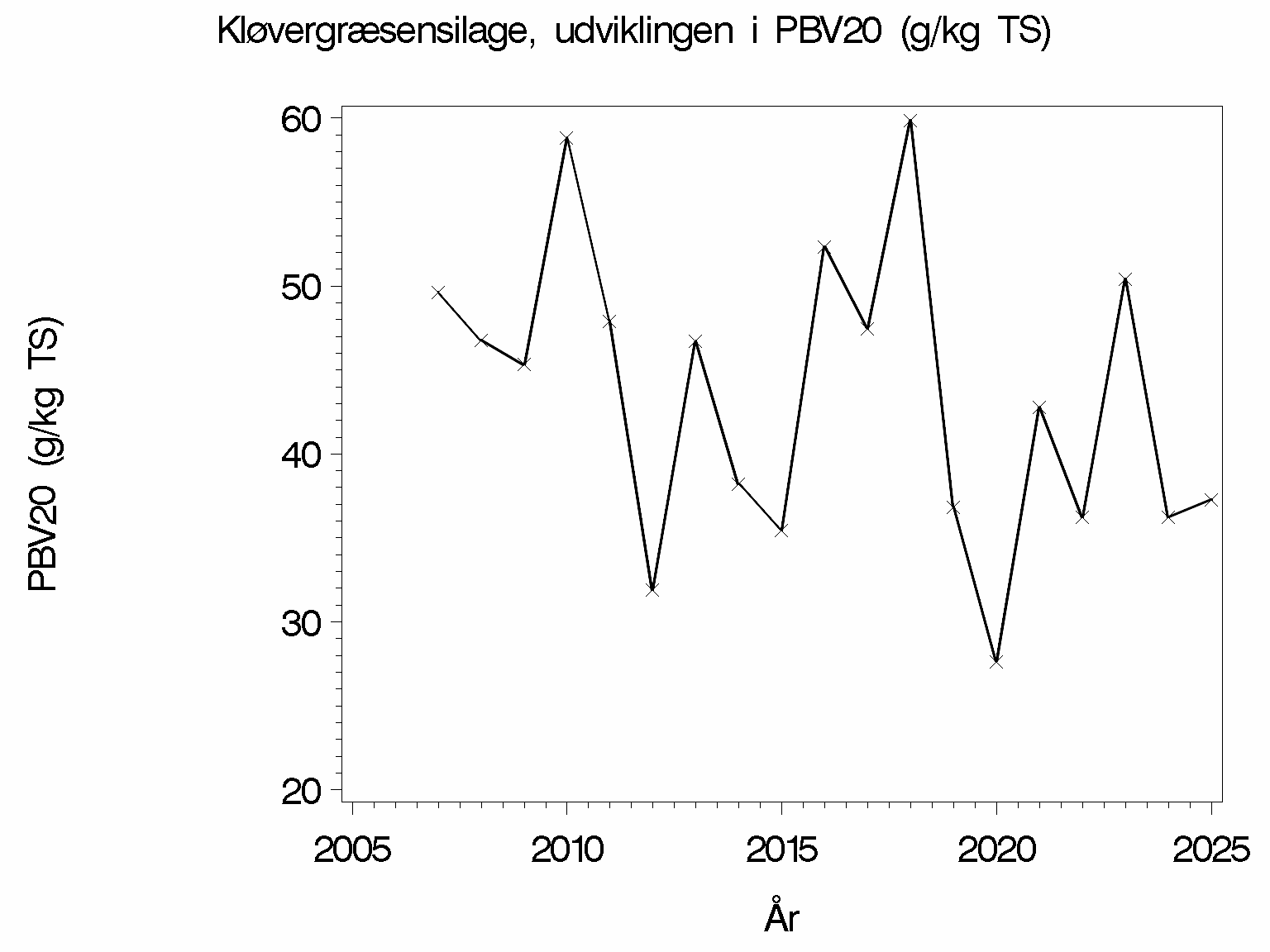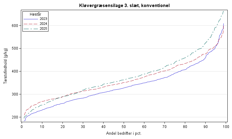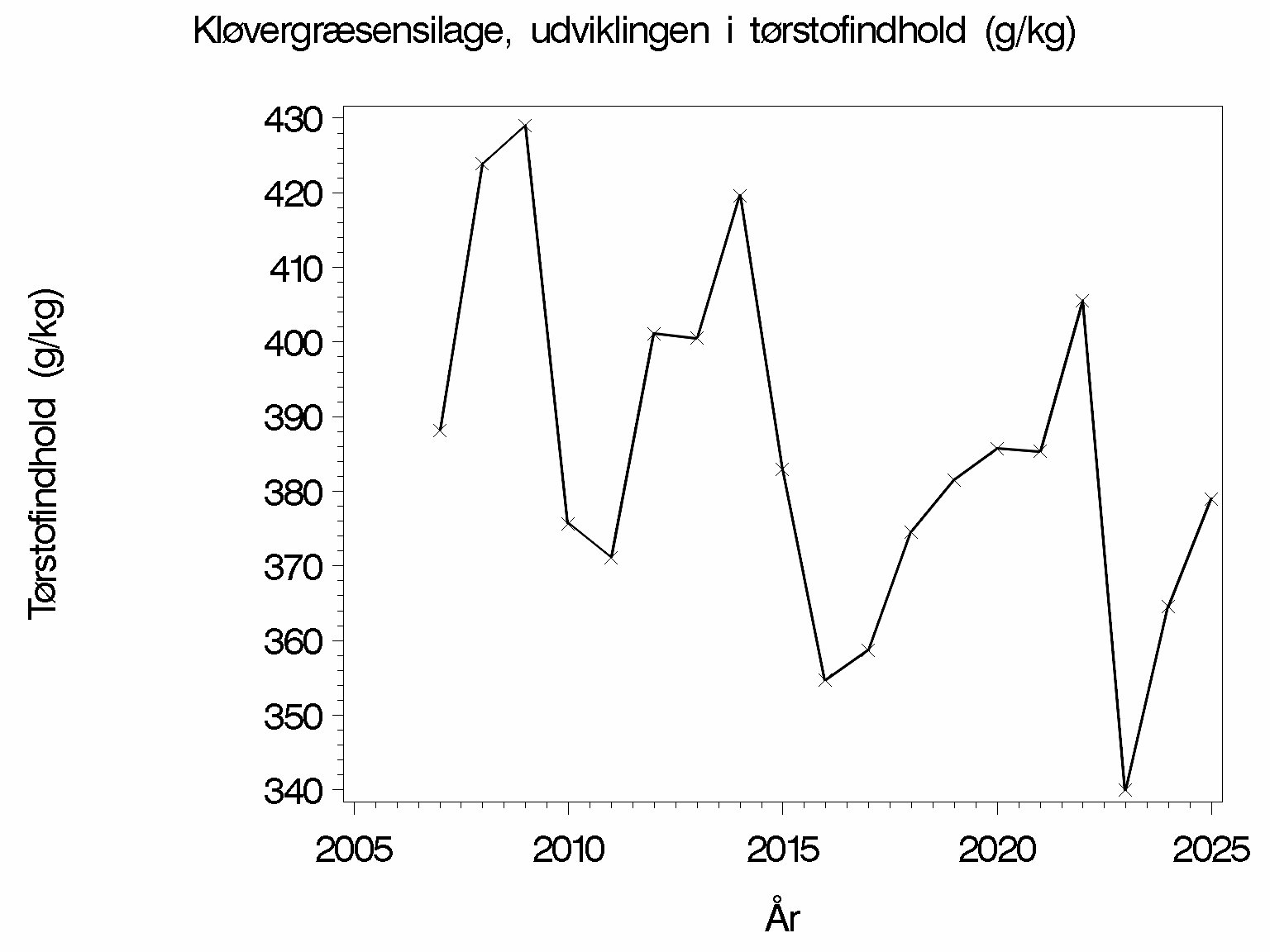 Hvis du klikker på på de enkelte analyserede parametre, f.eks. tørstof, så kommer du ind og ser en figur over udviklingen i denne parametre. Hvis du derimod klikker på tallene 10% nedre, så kan du se en figur, der viser spredningen mellem de analyserede prøver for dette høstår. Klik på det hvide kryds under nederste højre hjørne af figurerne for at komme tilbage igen.