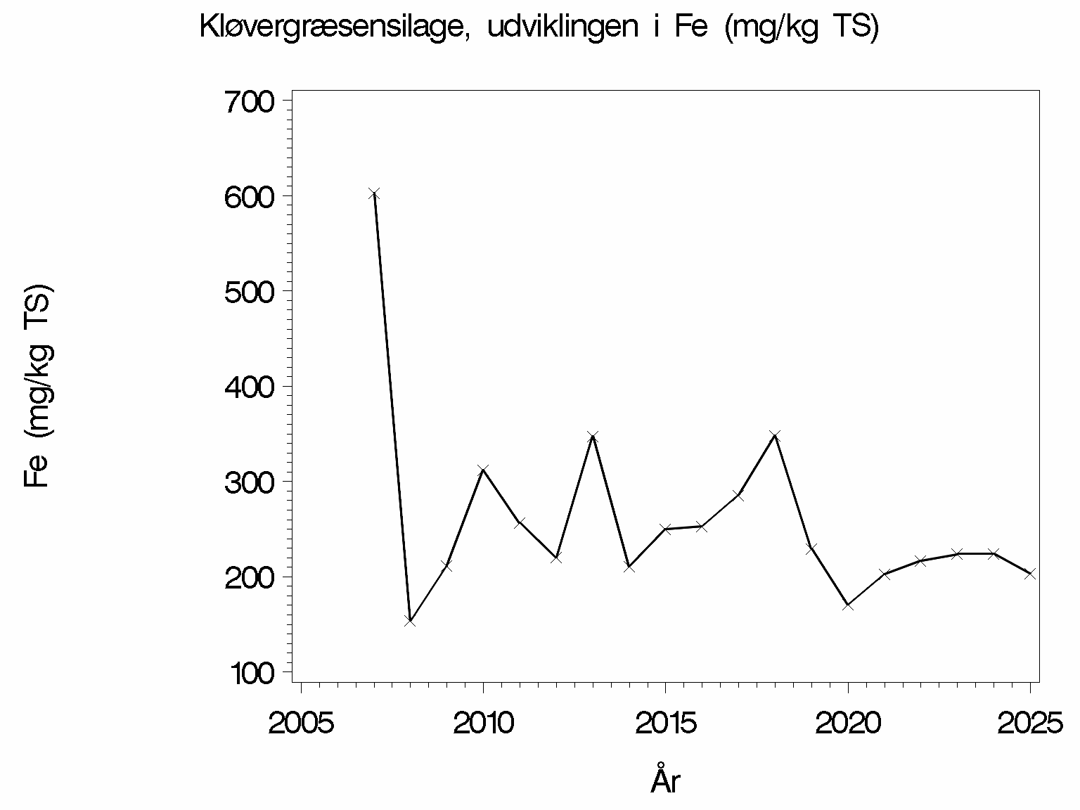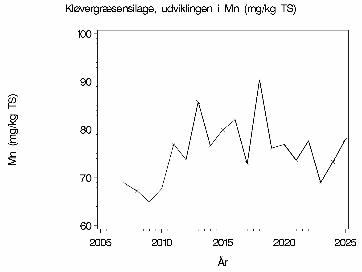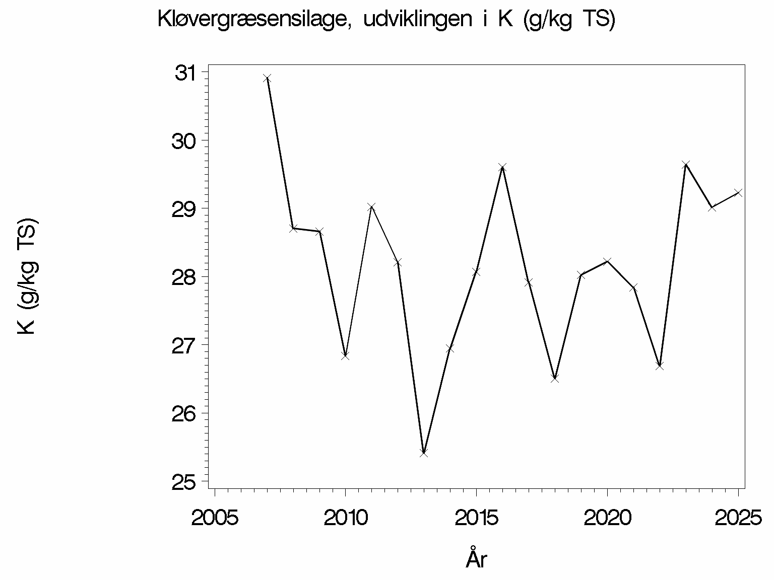 Hvis du klikker på på de enkelte analyserede parametre, f.eks. tørstof, så kommer du ind og ser en figur over udviklingen i denne parametre. Hvis du derimod klikker på tallene 10% nedre, så kan du se en figur, der viser spredningen mellem de analyserede prøver for dette høstår. Klik på det hvide kryds under nederste højre hjørne af figurerne for at komme tilbage igen.