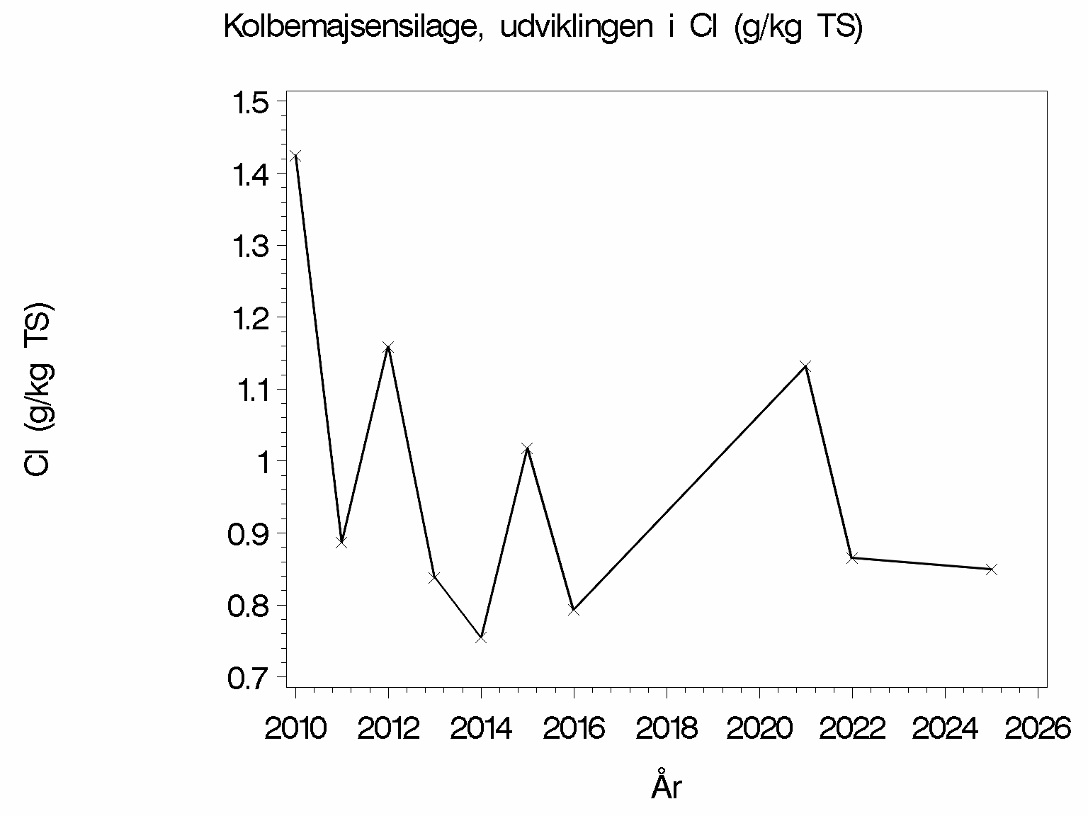 Hvis du klikker på på de enkelte analyserede parametre, f.eks. tørstof, så kommer du ind og ser en figur over udviklingen i denne parametre. Hvis du derimod klikker på tallene 10% nedre, så kan du se en figur, der viser spredningen mellem de analyserede prøver for dette høstår. Klik på det hvide kryds under nederste højre hjørne af figurerne for at komme tilbage igen.