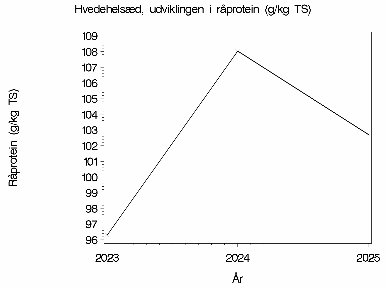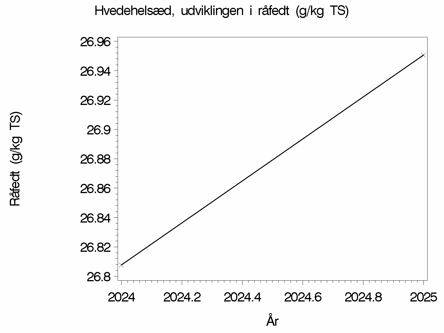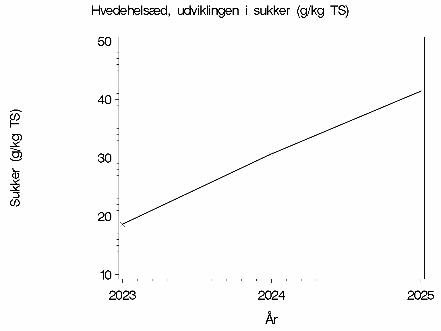 Hvis du klikker på på de enkelte analyserede parametre, f.eks. tørstof, så kommer du ind og ser en figur over udviklingen i denne parametre. Hvis du derimod klikker på tallene 10% nedre, så kan du se en figur, der viser spredningen mellem de analyserede prøver for dette høstår. Klik på det hvide kryds under nederste højre hjørne af figurerne for at komme tilbage igen.