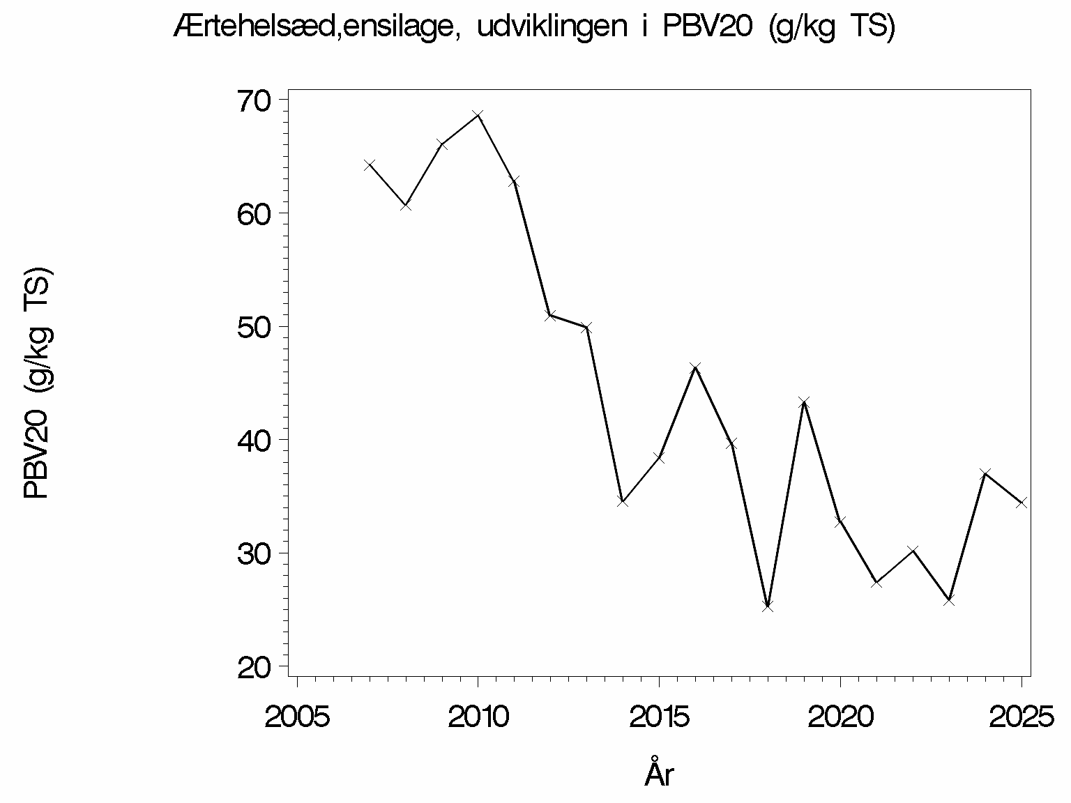 Hvis du klikker på på de enkelte analyserede parametre, f.eks. tørstof, så kommer du ind og ser en figur over udviklingen i denne parametre. Hvis du derimod klikker på tallene 10% nedre, så kan du se en figur, der viser spredningen mellem de analyserede prøver for dette høstår. Klik på det hvide kryds under nederste højre hjørne af figurerne for at komme tilbage igen.
