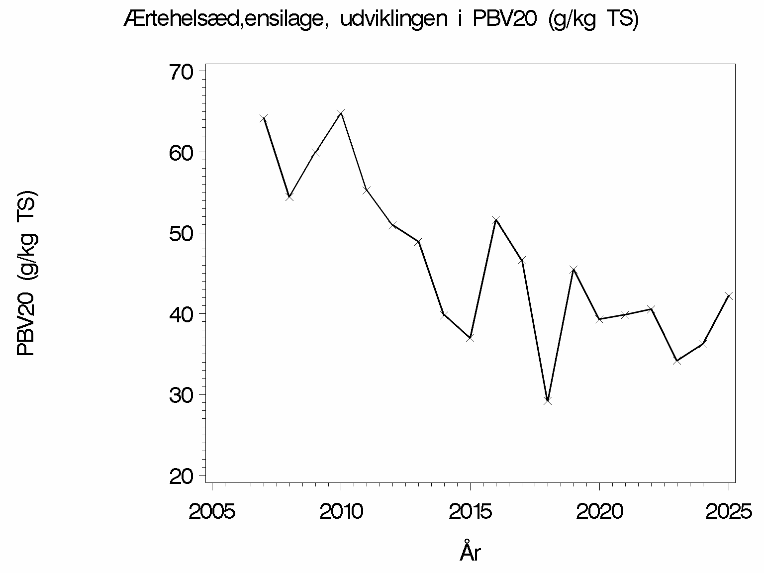 Hvis du klikker på på de enkelte analyserede parametre, f.eks. tørstof, så kommer du ind og ser en figur over udviklingen i denne parametre. Hvis du derimod klikker på tallene 10% nedre, så kan du se en figur, der viser spredningen mellem de analyserede prøver for dette høstår. Klik på det hvide kryds under nederste højre hjørne af figurerne for at komme tilbage igen.